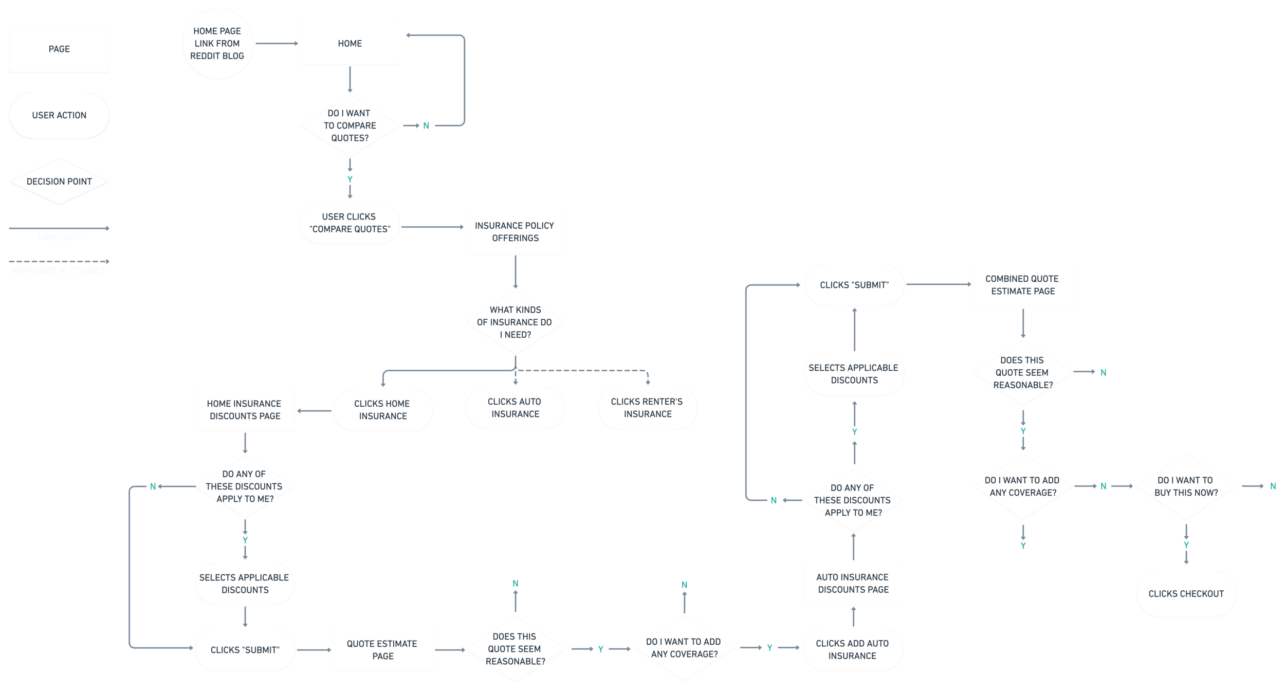 A crucial interaction for an e-commerce service is how users move through the site to bundle and purchase an insurance policy. I began to study the users experience of purchasing an insurance plan by stepping through the site map as a potential customer. Once a quote has been calculated, the checkout flow is very similar to that of any e-commerce website (collecting payment information). Up until this point there are opportunities to customize policy coverage if needed.